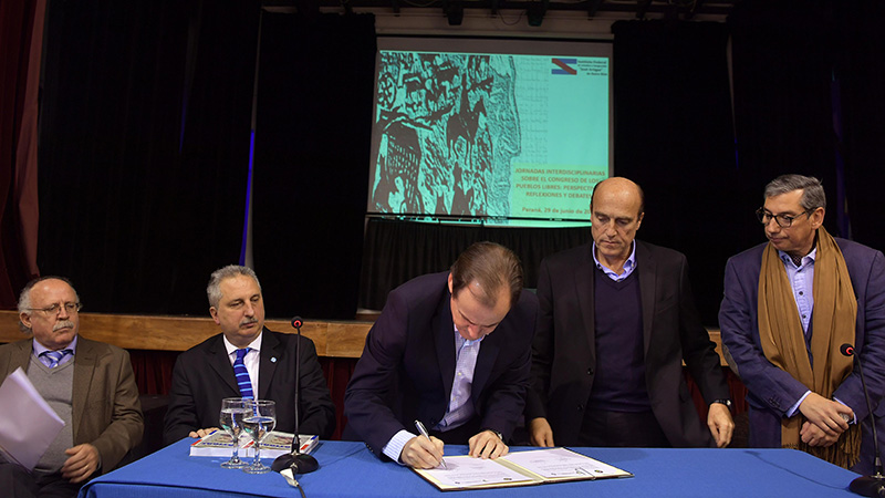 El gobernador Gustavo Bordet participó de las Jornadas Interdisciplinarias sobre el Congreso de los Pueblos Libres, que se realizan en Paraná, y firmó un convenio de trabajo y cooperación con el Congreso de Intendentes de la República Oriental del Uruguay. "Artigas planteó la independencia, la república y el federalismo en 1815. Hay un legado y una gesta histórica y a quienes nos toca esta función pública debemos rescatar la historia, tener la memoria y exponerla porque ese legado tiene mucho que ver con lo que nos pasa hoy día", afirmó Bordet.