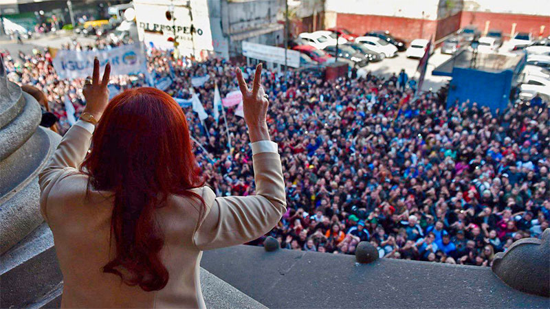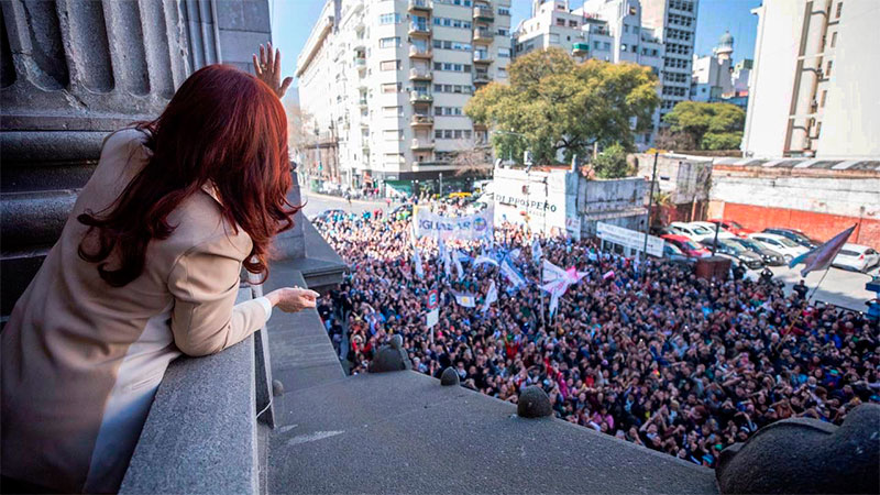 La vicepresidenta se asomó desde uno de los balcones del Congreso a saludar a los centenares de militantes que se acercaron a apoyarla, minutos después de hacer se descargo tras el pedido de los fiscales de condenarla a 12 años de prisión.
