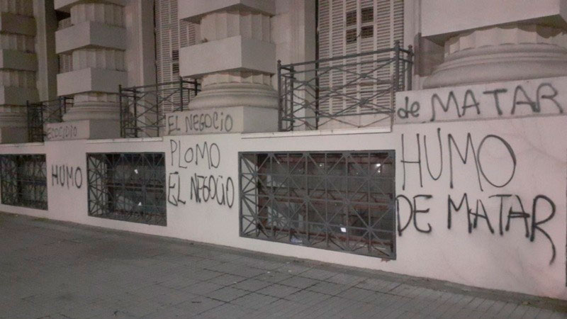 En la Gobernación, se centraron sobre calle Santa Fe y fueron del mismo tenor que las anteriores. “Basta de humo”, “humo es el negocio”, “Ecocidio”, “Plomo, basta de quemas” y “El negocio de matar”, eran las leyendas que podían leerse sobre el frente del histórico edificio ubicado frente a la plaza San Martín.