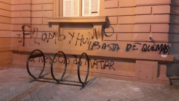 En el caso de la Municipalidad, las pintadas se focalizaron sobre los laterales de la fachada y los pedestales de los leones.