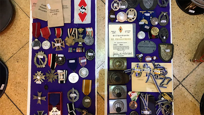 En el local de antigüedades había exhibidos para la venta al público cuatro cascos, cinco gorras, un birrete, cinco dagas, dos cuchillos, cinco hebillas, un lienzo y 53 medallas, "todas con simbología nazi, a saber: cruz esvástica (algunas tapadas), cruz de hierro y águila imperial", informó la Federal.