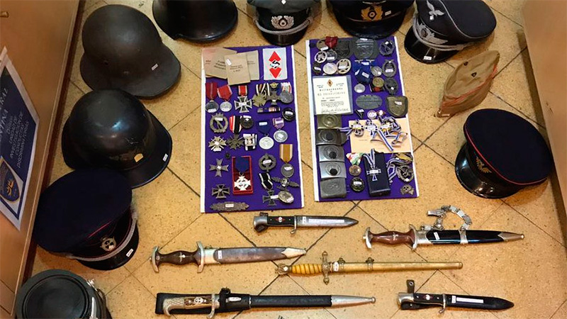 Hay cascos, cuchillos y medallas con simbología del régimen de Hitler. La ministra de Seguridad, Patricia Bullrich, celebró el operativo ya que "es importante terminar con estos trágicos símbolos de discriminación y horror".