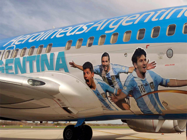 Recalde aseguró que el avión está ploteado con imágenes de las estrellas que representan los campeonatos ganados; de la pelota oficial del mundial; “firuletes porteños”; y con las caras de los tres principales delanteros de la selección, Lionel Messi, Gonzalo “Pipita” Higuaín y Sergio “Kun” Agüero.