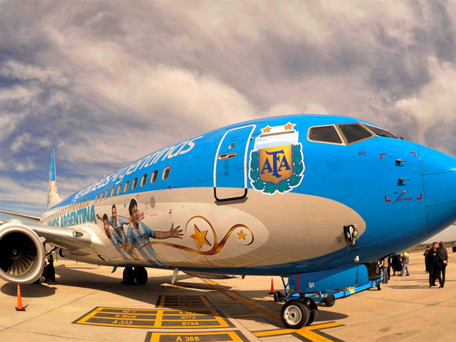 Aerolíneas Argentinas presentó el avión que trasladará al seleccionado de fútbol argentino a Brasil, en donde se jugará desde el 12 de este mes la Copa del Mundo. El avión, ploteado con imágenes del Mundial, volará luego por la Argentina.