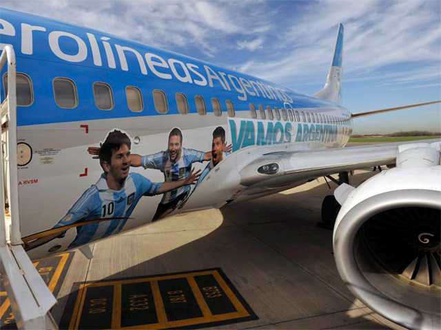 “Es un ploteo que no le hace daño al avión, que aparte representa cosas que tienen que ver con el Mundial y que lo hacen gran parte de los países. Adentro es el mismo avión, es un avión de línea que la AFA (Asociación del Fútbol Argentino) contrató para hacer el vuelo de ida, que es la semana que viene. Los trasladan a Belo Horizonte”, aseguró Recalde.