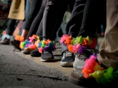 Las militantes allí reunidas y a la espera de un posible saludo de Cristina decidieron colocarse tobilleras de flores de colores, en muestra de apoyo a la insólita resolución de los jueces: "Cristina es inocente y la tobillera nos la ponemos todas".