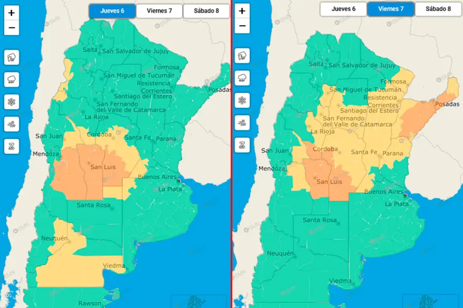 “Conforme el sistema de altura se desplace al noreste, las lluvias y tormentas se irán focalizando especialmente, sobre las provincias del noreste del país, en donde actualmente, rige una alerta de nivel amarillo para el viernes, pero que podría aumentar a nivel naranja en algunas zonas en las próximas actualizaciones del organismo oficial”, referenció el meteorólogo Leonardo De Benedictis en su informe para Meteored.