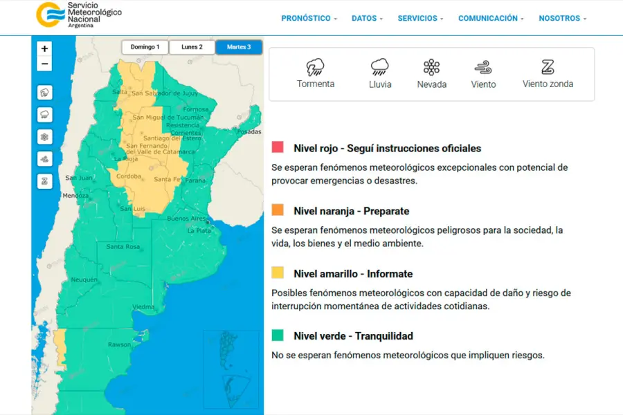 Además, rige una alerta amarilla por vientos fuertes en La Rioja, Córdoba, San Luis, Neuquén, Río Negro, Chubut y Santa Cruz.
