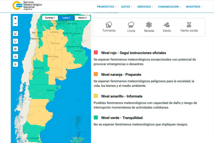 El Servicio Meteorológico Nacional (SMN) emitió alertas por lluvias y tormentas en algunas zonas de Mendoza, San Luis, Río Negro, Neuquén, Chubut y Santa Cruz.