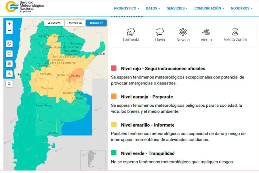 En tanto, el alerta naranja por tormentas fue emitido para los departamentos de Diamante, La Paz, Nogoyá, Paraná, Villaguay, Federal, Feliciano, Federación, Concordia y San Salvador. En estas zonas, el organismo nacional anticipó condiciones meteorológicas más severas.