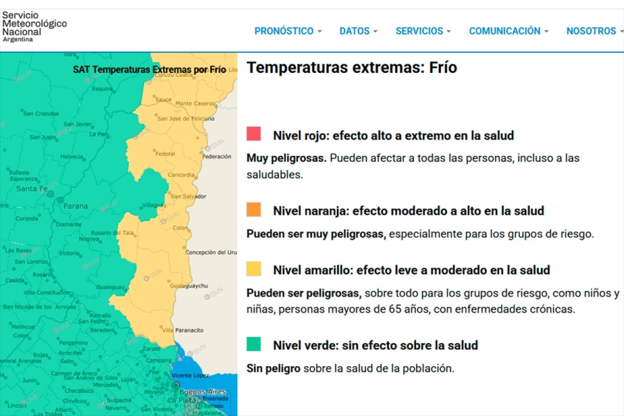 El informe por frío extremo anunciado por el organismo nacional, incluye a la zona este de Entre Ríos, la provincia de Santa Cruz, Chubut, Río Negro, Neuquén, este de Buenos Aires, la zona este de Corrientes, parte de Salta y zonas de Jujuy.
