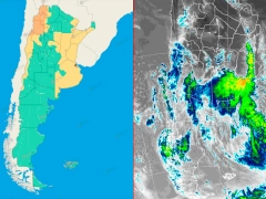 La zona en alerta y la imagen satelital de mediodía. Foto: SMN