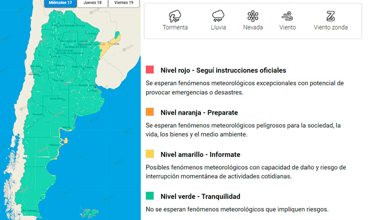 El Servicio Meteorológico Nacional (SMN) emitió esta mañana un alerta de nivel amarillo por tormentas con ráfagas de hasta 90 kilómetros por hora (km/h) para sectores de Corrientes y Misiones, a la vez que rige otro alerta amarillo por vientos para las costas marítimas de Río Negro y Chubut.