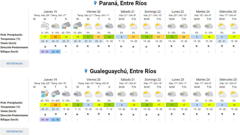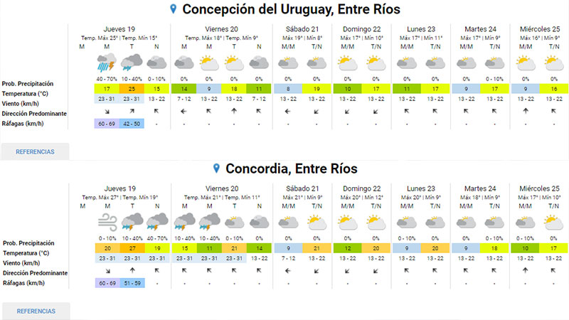 Para la provincia de Entre Ríos rigen dos alertas. Para los departamentos Colón, Gualeguaychú, Islas del Ibicuy, Tala y Uruguay se advierte sobre “tormentas, algunas fuertes de manera aislada presentando a su paso granizo de diversos tamaños e intensas ráfagas”. Se esperan “valores de precipitación acumulada entre 10 y 25 mm., pudiendo ser superados de forma puntual”.
