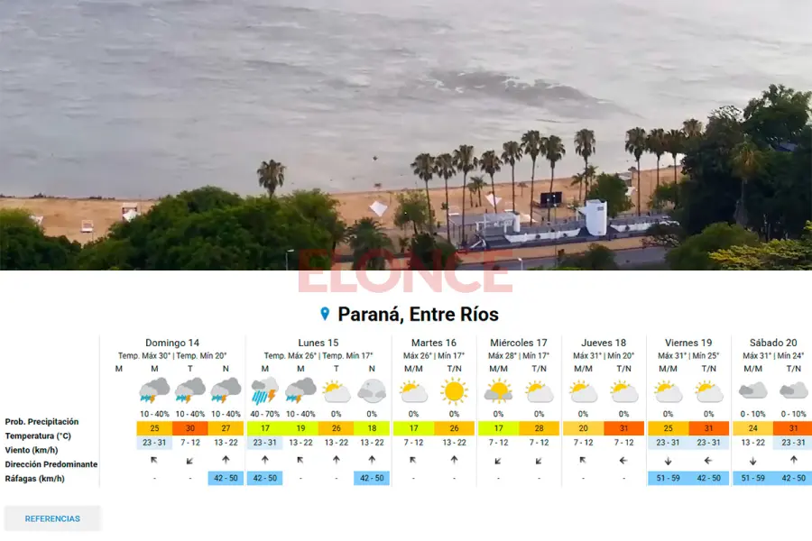 Para Paraná, se prevé una jornada con tormentas aisladas, vientos del sudeste rotando al noreste y para la noche están pronosticadas ráfagas de viento sur de entre 42 y 50 km/h. Las temperaturas oscilarán entre los 20 y 30ºC.