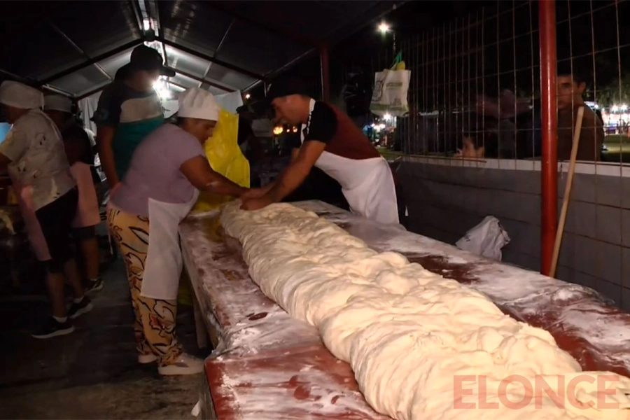 Laura Martínez y su hija amasaron el pan casero de tres metros de largo en el marco de la Fiesta del Pan Casero en Sauce de Luna. En diálogo con Elonce, describió: “Un trabajo bastante pesadito, sobre todo por el calor. Empezamos a desparramar la harina que eran tres bolsas (75 kilos), un kilo y medio de levadura, un kilo y medio de sal, 24 litros de agua y siete kilos y medio de grasa vacuna.