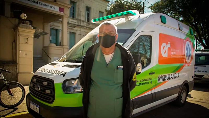 "Hace cuatro años que soy chofer de ambulancia. Antes de la pandemia nos dedicábamos a los traslados de pacientes que se tenían que hacerse estudios como tomografías o resonancias en los centros asistenciales de Gualeguaychú. Ahora estamos dedicados de lleno a los pacientes covid. Todos los días, el operador del 107 nos indica si vamos a domicilio, al consultorio febril, al hotel o a otro centro, y nosotros cumplimos en llevarlo", describe Horacio, el más grande del equipo, minutos después de bajarse de la ambulancia, en el ingreso de la calle Pasteur.