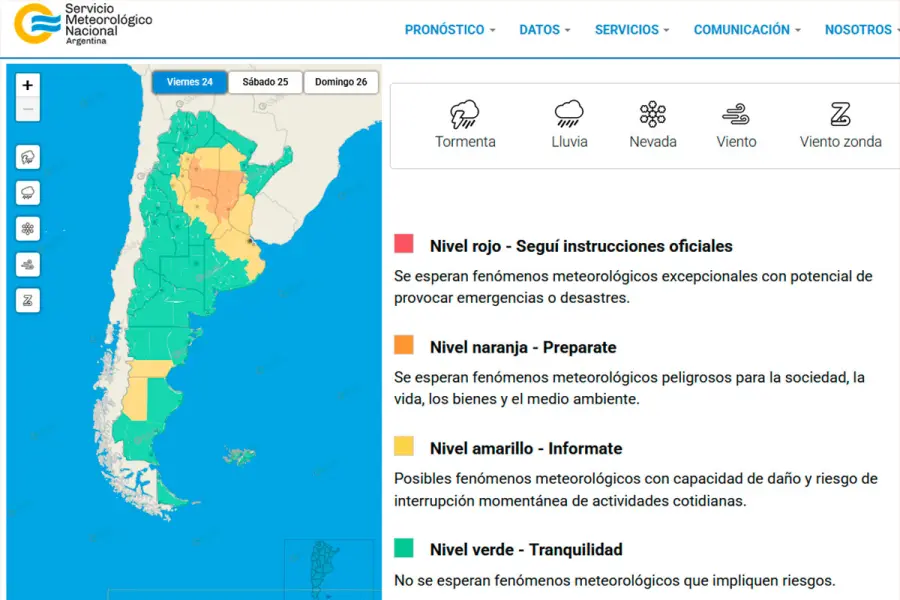“El norte de Córdoba, Santiago del Estero, norte de Santa Fe, Chaco, Corrientes y norte de Entre Ríos, serán afectados por tormentas fuertes o localmente severas. Las mismas podrían provocar abundante caída de agua en cortos períodos, actividad eléctrica frecuente, granizo y ráfagas mayores a los 100 km/h”, anticipó el SMN.