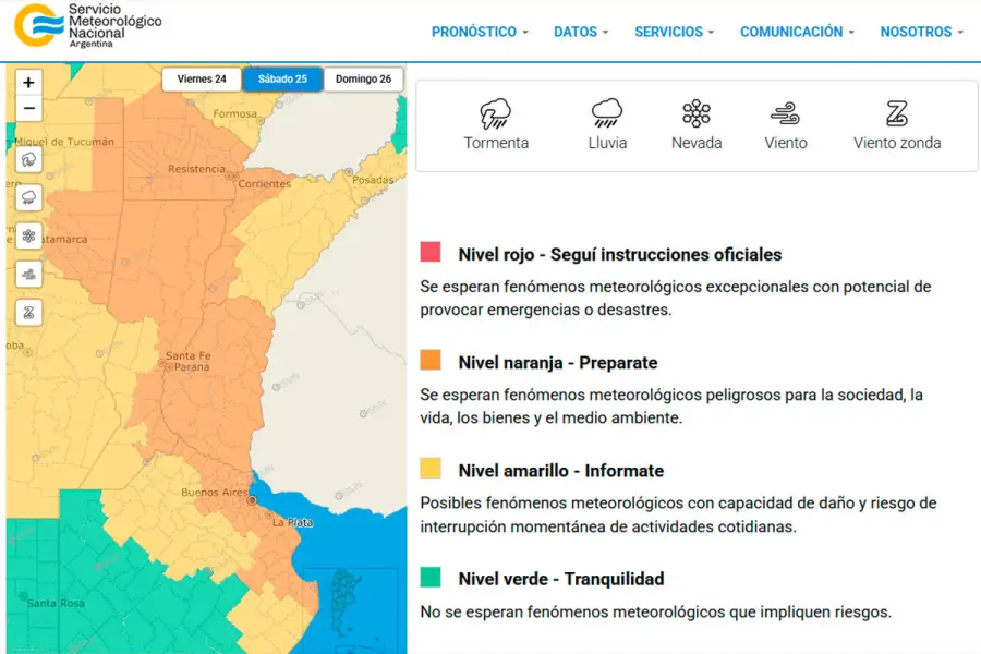 Según el organismo, el aviso de alerta naranja por tormentas severas para el sábado por la mañana, incluye a Entre Ríos y zonas de las provincias de Buenos Aires, Santa Fe, Corrientes, Santiago del Estero, Chaco.