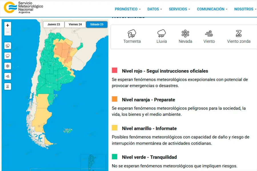 El Servicio Meteorológico Nacional (SMN) amplió esta tarde, una alerta naranja por tormentas severas que afectarán a Entre Ríos y otras provincias durante el viernes 24 y sábado 25 de octubre.