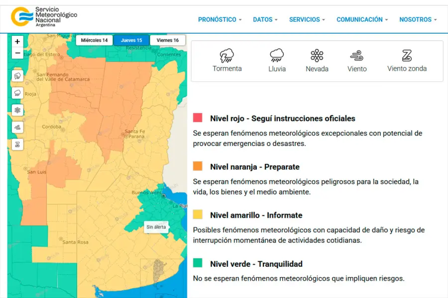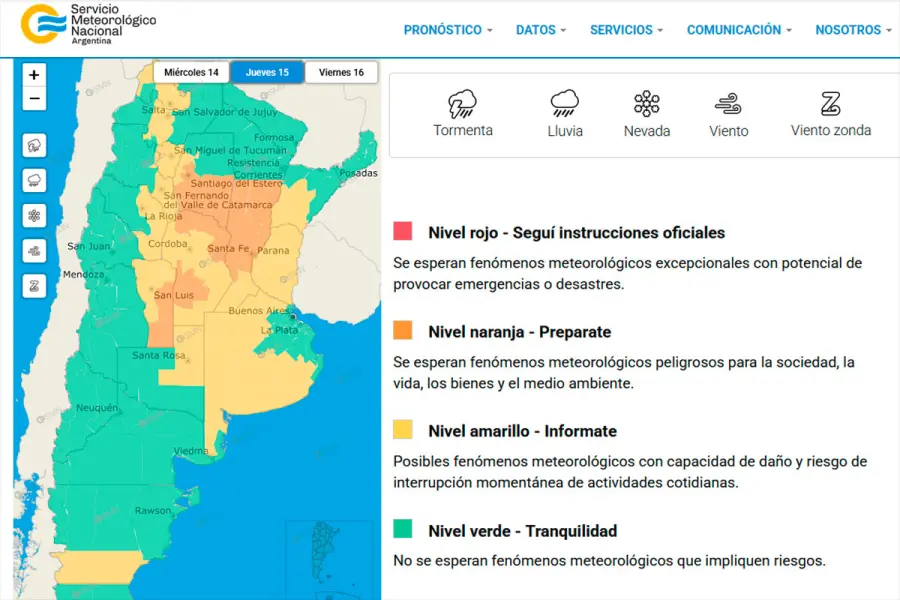 Asimismo, el Servicio Meteorológico Nacional emitió un aviso de alerta naranja que regirá durante la noche del jueves para zonas específicas de las provincias de Córdoba, San Luis, Santa Fe y Santiago del Estero. En estos distritos, las condiciones previstas fueron calificadas como más severas.