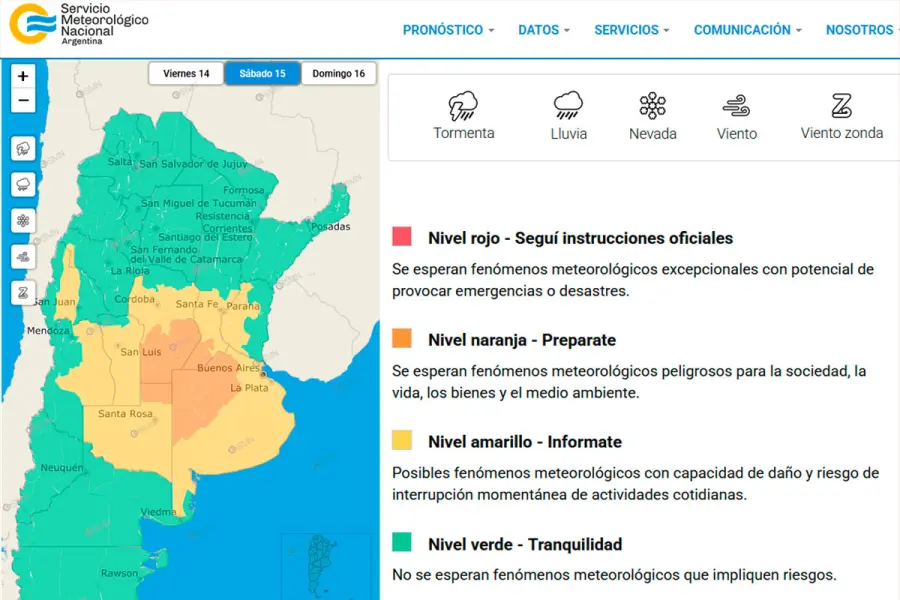 Según el reporte del SMN, en la noche del sábado y la madrugada del domingo, la zona será afectada “por lluvias y tormentas de variada intensidad, algunas localmente fuertes. Las mismas podrán estar acompañadas por abundante caída de agua en cortos períodos, frecuente actividad eléctrica, y principalmente, caída de granizo e intensas ráfagas que puede alcanzar los 90 km/h”. Además, se “prevén valores de precipitación acumulada entre 20 y 60 mm, pudiendo ser superados de manera puntual”, indicó el organismo.