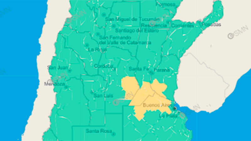 En base a la publicación en el sitio oficial, se destaca que hay una alerta amarilla: “El área será afectada por tormentas de variada intensidad, algunas localmente fuertes con abundante caída de agua en cortos periodos, caída de granizo, fuerte actividad eléctrica y ráfagas”.