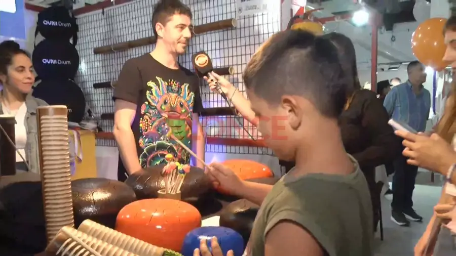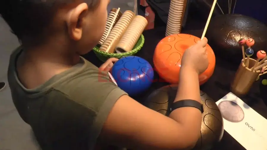 Al momento de la entrevista, un niño tocaba uno hecho en metal, que tiene diferentes notas, tamaños, colores. “Se usa con las manos y palillos, para música o meditación”, explicó.