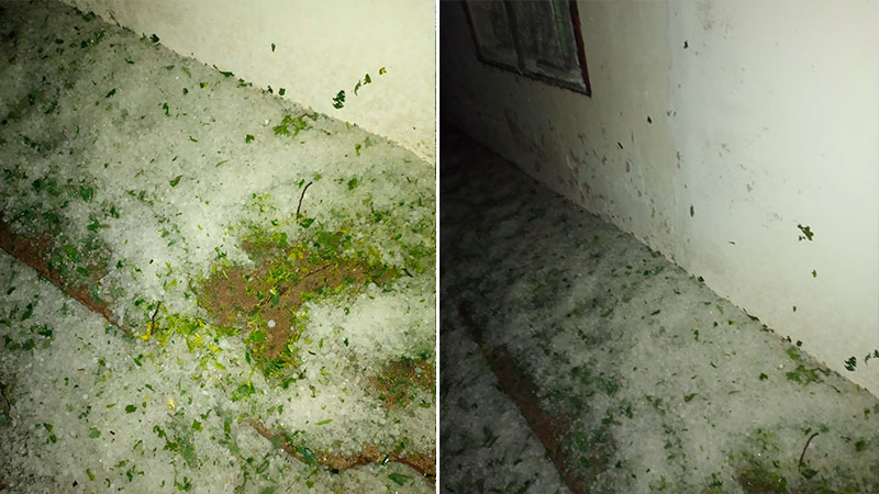 En el video que se puede ver en esta nota, un amigo de Rodolfo, muestra el hielo, que aún intacto detrás de la casa del productor. Las imágenes fueron tomadas este martes, pasadas las 10 de este martes. “Es impresionante”, afirma y agrega que “el granizo hizo daño a los animales, algunos quedaron ciegos y los árboles quedaron pelados”, señala, según pudo conocer Elonce.