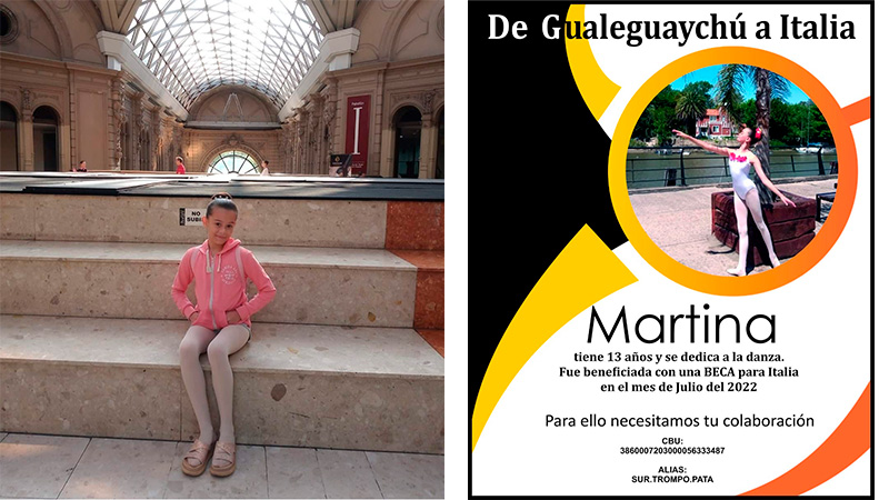 Martina Albornoz tiene 13 años y es oriunda de Gualeguaychú. Sueña con ser bailarina y viajar a Italia para perfeccionarse en un “Seminario intensivo de Danza Clásica”. La adolescente obtuvo una beca y debe viajar en junio a Florencia, donde la espera Claudia Zaccari, “Primera Ballerina del Teatro dell’Opera di Roma”.