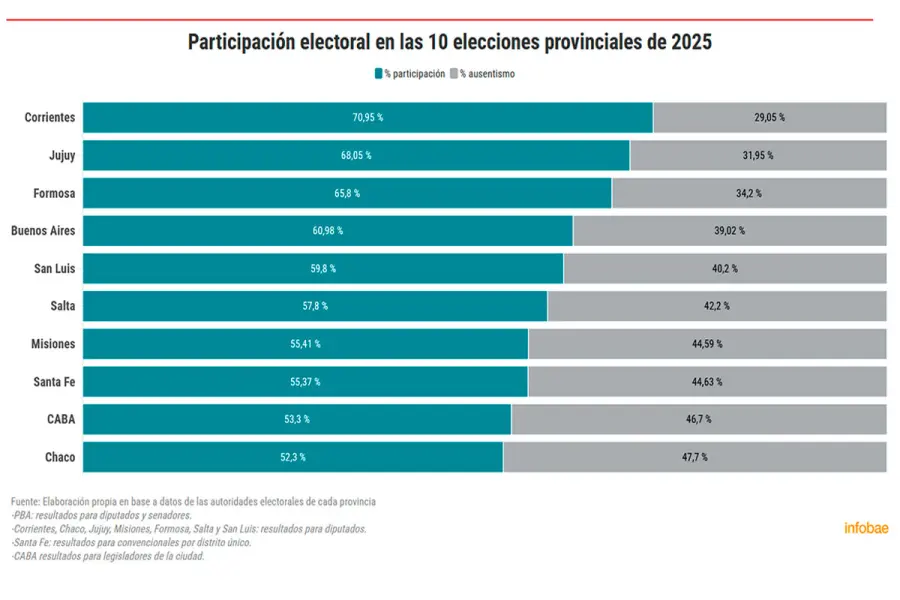 Los valores específicos registrados en esas 10 provincias fueron los siguientes: Corrientes 70,95 %, Jujuy 68,1 %, Formosa 65,8 %, Buenos Aires (Provincia) 60,98 %, San Luis 59,8 %, Salta 57,8 %, Misiones 55,4 %, Santa Fe 55,4 % (para convencionales constituyentes) y Ciudad Autónoma de Buenos Aires 53,3 %. Los datos confirman que la baja participación no es un hecho aislado, sino parte de una tendencia nacional.