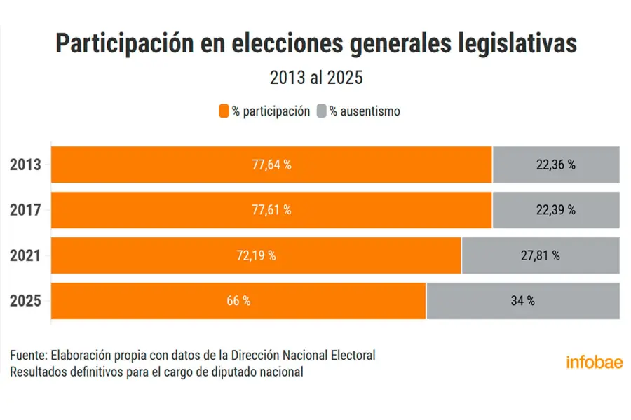 La jornada electoral evidenció una de las más bajas participaciones desde el retorno de la democracia. Según datos oficiales publicados tras el cierre del escrutinio, la concurrencia fue del 66 % del padrón nacional, lo que marca una caída significativa en relación con promedios históricos. Sobre un total de 35.987.634 personas habilitadas, el ausentismo alcanzó los 12.235.796 electores.