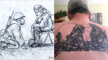 El mismo dolor. "Un ciudadano británico y me mandó esta foto de un tatuaje que se hizo en su espalda", contó el dibujante entrerriano que unió con una obra realizada en lápiz, a una mujer con su hijo caído en la Guerra de Malvinas.