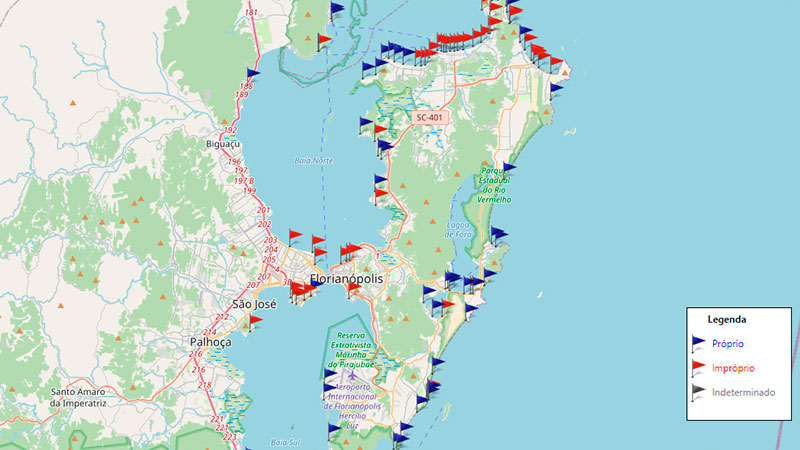 Un poco más al norte, en Florianópolis y alrededores, el mapa cambia de color y muchos balnearios están severamente afectados: como Canasvierias, ingleses, Sambaqui, Camboriu, Iatapema, Bombas y Bombinhas.