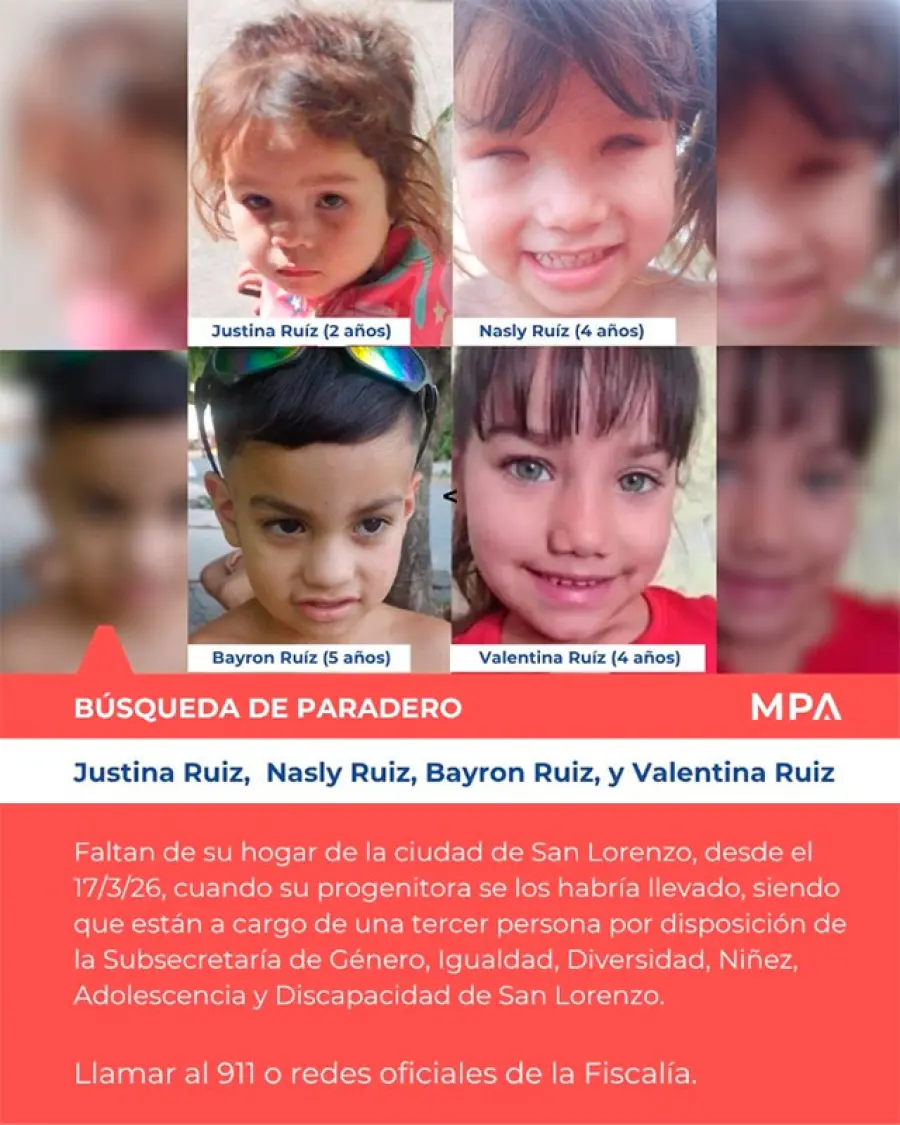 Se trata de los hermanos Valentina Ruiz, de 4 años; Bayron Ruiz, de 5; Nasly Ruiz, de 4; y Justina Ruiz, de 2, quienes se ausentaron de su vivienda ubicada en calle Carrillo al 100. Según se informó oficialmente, los niños habrían sido retirados del lugar por su madre.