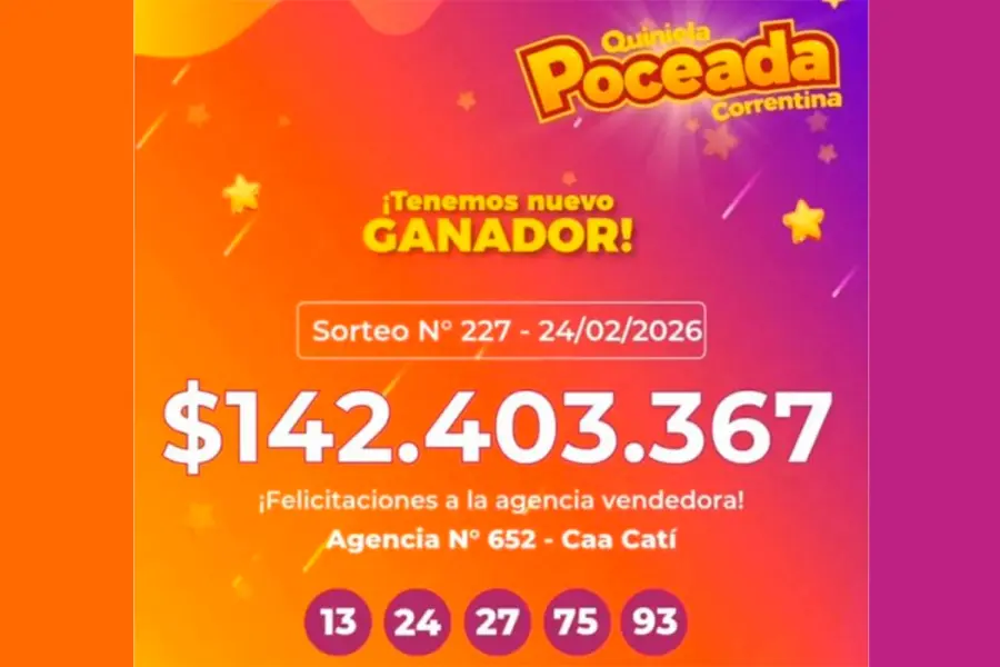 En el último sorteo, realizado el martes 24 de febrero, un jugador obtuvo el pozo acumulado de $142.403.367 tras acertar la combinación 13 - 24 - 27 - 75 - 93. El ticket ganador fue emitido en la Agencia Oficial N° 652 de esa localidad correntina, que ya confirmó la validación de la jugada.