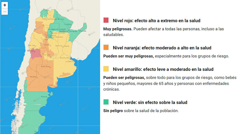 El rojo advierte sobre riesgo “muy peligroso” para la salud. En tanto que gran parte del resto de las provincias permanece bajo alertas naranjas y amarillas por la ola de calor que recorre el país.
