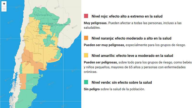 Para el norte de la Patagonia, rige la alerta naranja que implica un efecto moderado a alto en la salud, donde las temperaturas pueden “ser muy peligrosas, especialmente para los grupos de riesgo”, según las indicaciones del SMN.
