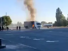 Efectivos policiales y bomberos voluntarios de Luján de Cuyo acudieron rápidamente al lugar y lograron controlar el siniestro, que dejó daños materiales en la lona del tráiler, las cuatro ruedas del lateral derecho y parte del techo del tractor.