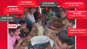 Los comensales de la mesa: 1- Loan. 2- José Peña, papá de Loan. 3- Carlos Pérez, detenido. 4-María Victoria Caillava, detenida. 5-Catalina Peña, abuela de Loan. 6-Antonio Benítez, detenido. 7- Daniel Ramírez, detenido. 8-Mónica Millapi, detenida.
