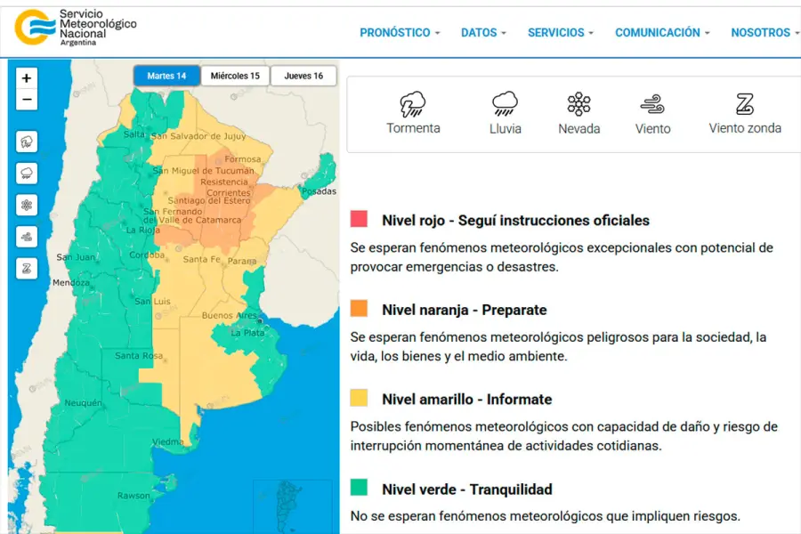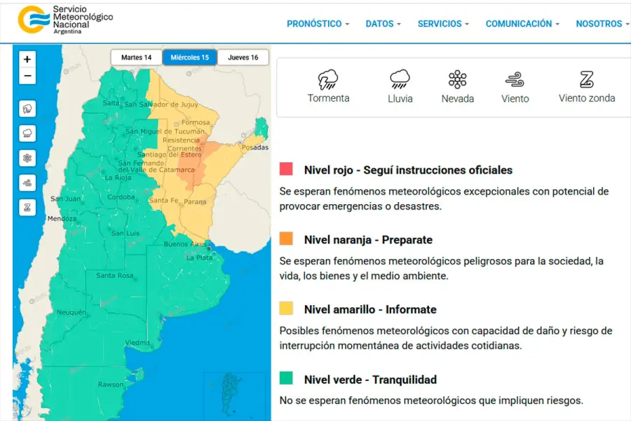 Además, de Entre Ríos, el aviso de alerta por tormentas, incluye, a Buenos Aires, La Pampa, Córdoba, Santa Fe, Corrientes, Santiago del Estero, Chaco, Formosa, Salta y Jujuy.