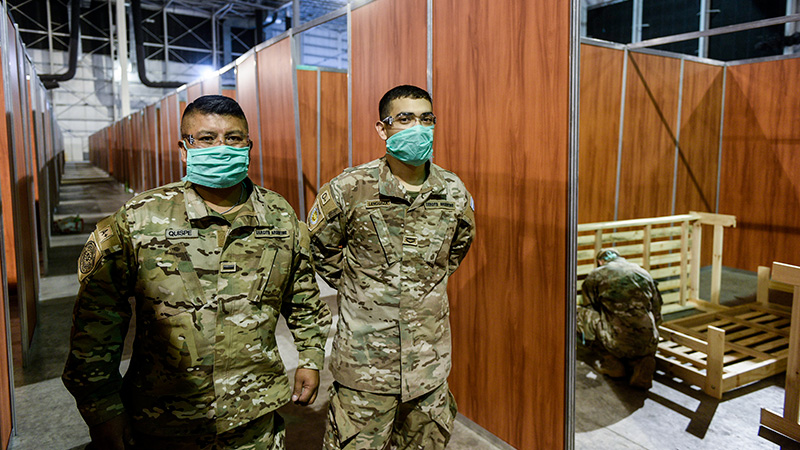 La Nación construye en el predio varios pabellones con capacidad para 2452 camas no hospitalarias destinadas a enfermos leves de coronavirus. El lugar tiene además espacios destinados a la farmacia y otros de descanso para el personal.