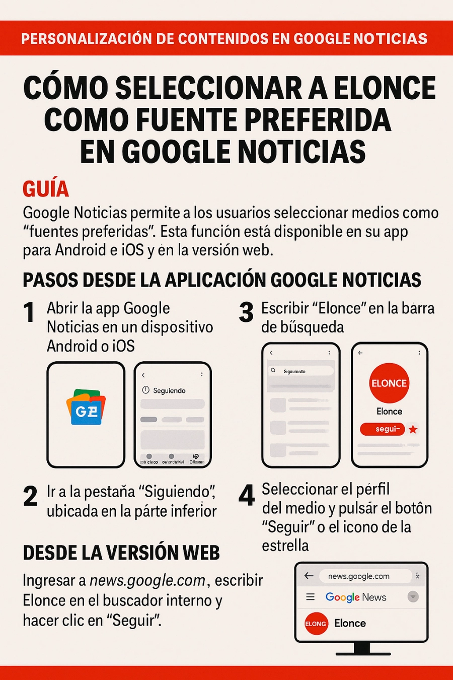 De esta manera, Google Noticias permite a los usuarios personalizar la información que reciben, seleccionando medios de comunicación como “fuentes preferidas”. Esta función, está disponible tanto en la versión web como en la aplicación para celulares, y los lectores de Elonce pueden personalizar su feed.