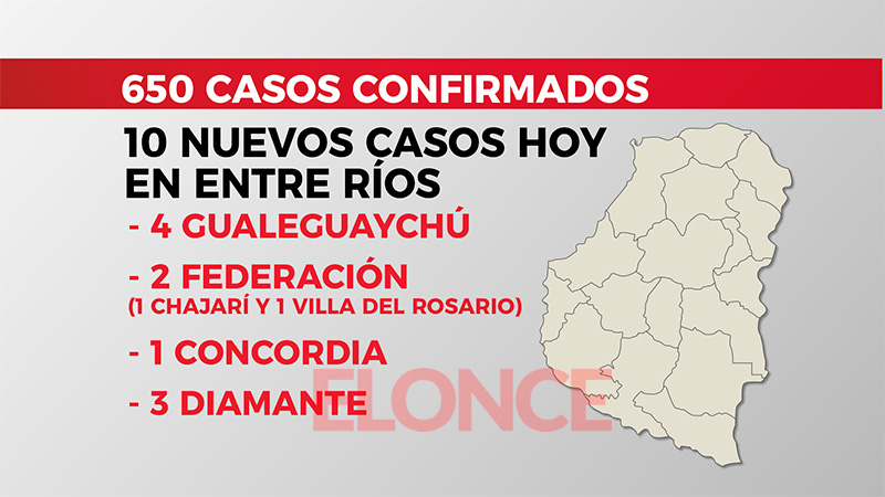 Y el caso restante, fue confirmado en el departamento Uruguay, se trata de un profesional que reside en Buenos Aires pero que trabaja en la provincia.