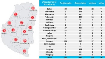 Con pocas personas que contrajeron la enfermedad están: el departamento Uruguay con 5 casos, Concordia con 3 pacientes, los departamentos Diamante, Villaguay y Gualeguay con 2 casos, y La Paz y Nogoyá con 1 caso desde el inicio de la pandemia.