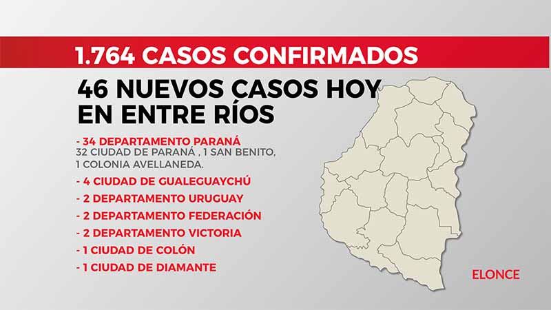 En Entre Ríos se han sumado 46 nuevos casos de Coronavirus. 32 fueron detectados en Paraná y el resto en siete departamentos. Además, se confirmó un nuevo deceso asociado a Covid-19.