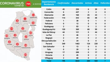 La mayor concentración de casos se presenta en el departamento Paraná con 349 confirmados. Le siguen Gualeguaychú con 159, Federación con 114, Diamante con 49, Colón con 45 casos, Islas del Ibicuy con 44; y Uruguay con 17, según los datos reportados este jueves.