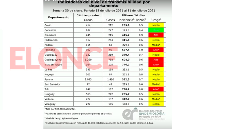 “En relación a la distribución geográfica y los indicadores epidemiológicos que se evalúan semanalmente, se observa que continúa el descenso global de casos de Covid-19 en todos los departamentos de la provincia”, refirió el funcionario provincial al destacar que “la mayoría de los departamentos se encuentra en un riesgo epidemiológico medio u otros, como Concordia, en un nivel bajo de riesgo epidemiológico”.