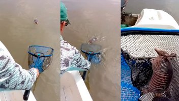 Un grupo de pescadores rescató a un tatú mulita que se encontraba en peligro. En las imágenes se puede observar el momento exacto en que el animal es salvado y cómo lo devuelven a la costa.