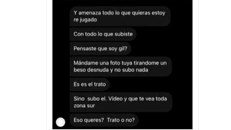 “Estoy re jugado con todo lo que subiste”, le dijo el hombre en alusión al escrache. Y siguió: “¿Pensaste que soy gil? Mandame una foto tuya desnuda tirándome un beso y no subo nada. Ese es el trato. Si no, subo el video y que te vea toda zona Sur. ¿Eso querés? ¿Trato o no?”.